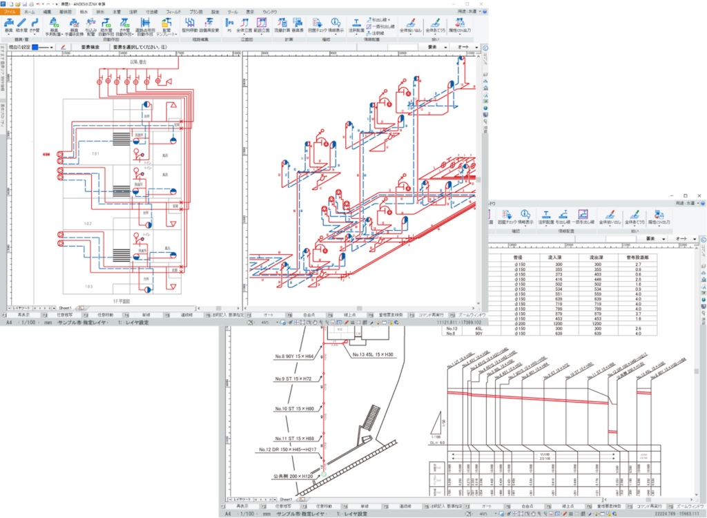 水匠NX申請は、水道工事に特化したCADシステムです。専門知識がない方でも図面を仕上げられることを目指して、AIを活用した給排水申請図の自動作図機能を提供しています。戸建て住宅や集合住宅の給水・排水平面図、立面図も作成可能です。